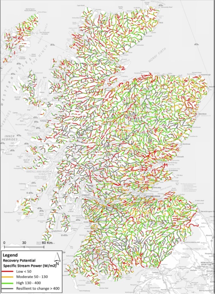 Description: This layer describes the Recovery Potential of a reach, which is a measure of river energy based on specific stream power (W/m2) (see lineage section to understand how SSP is calculated). Rivers with higher energy have a greater capacity to 'self-heal' and can be restored using passive restoration techniques. In contrast, lower energy rivers require more costly interventionist restoration approaches such as remeandering. Through understanding the energy regime of the river we can design restoration to minimize the work needed and maximize the length of river improved by working with and enhancing the natural processes of the river. The dataset was developed in conjunction with the 'Will the river do the work?' (will-the-river-do-the-work.pdf (sepa.org.uk)) SEPA technical report and more information about how it was calculated can be found there.